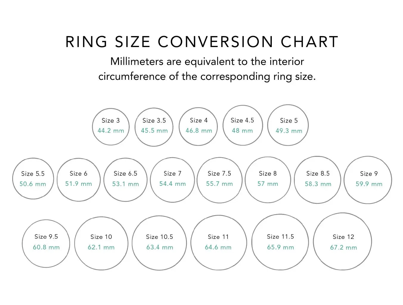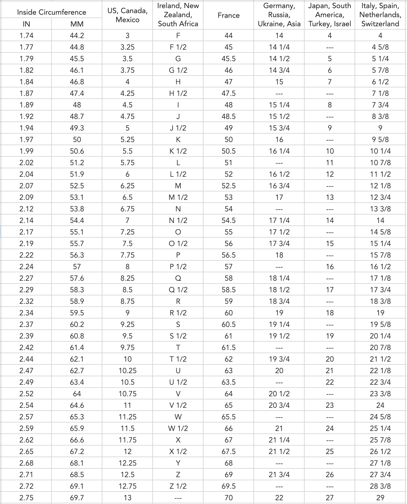 All of our rings are crafted in standard US sizes. View the chart below to see how US sizes map to finger circumference and convert to international sizes. Engagement rings, wedding bands, and fashion rings all follow the same size format.